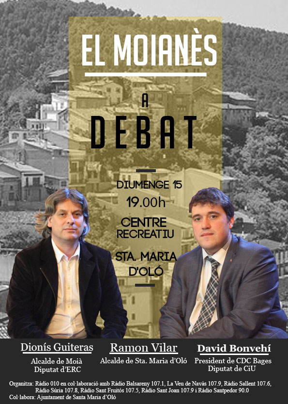 Aquest diumenge dia 15, estarem a les 7 de la tarda al Centre Recreatiu, moderant el debat sobre el Moianès. La cobertura es farà juntament amb les emisores municipals del Bages. Al llarg de la setmana publicarem l’enllaç d’es del que ens podreu escoltar en streaming.