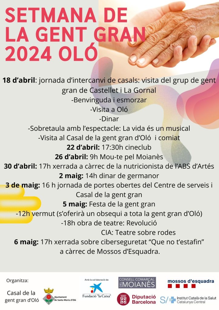 Avui divendres hi haurà una jornada de portes obertes al centre de dia i al casal per donar a conèixer l’equipament. Diumenge hi haurà el vermut popular on l’ajuntament repartirà el tradicional obsequi per a la gent gran. Una de les primeres activitats destinades a la gent gran quan es va crear la Festa dels avis. Sol reunir a la gent gran del poble acompanyats de familiars. Anna Grau és presidenta de l’associació de la gent gran d’Oló.